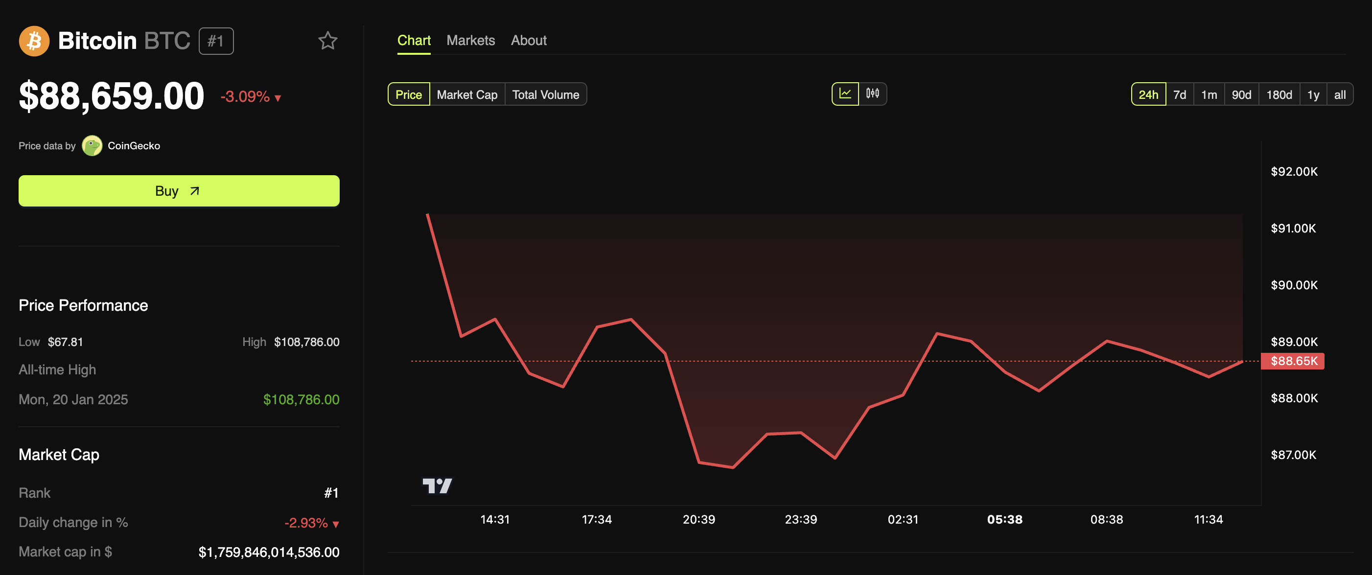 På presstidspunktet handlet Bitcoin til $ 88 659, ned 3,0 % de siste 24 timene. Frykt- og grådighetsindeksen sto på 21, noe som indikerer ekstrem frykt i markedet. Dette antydet at investorer er svært forsiktige, potensielt i panikk og selger sine aktiva på grunn av usikkerhet eller nylige prisfall.