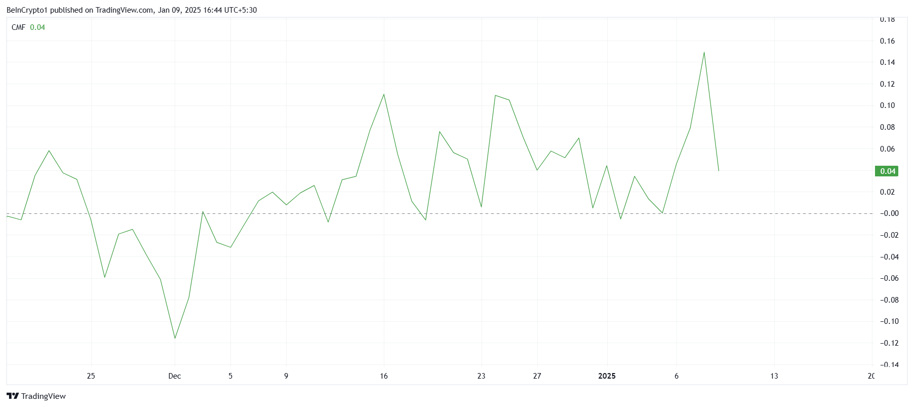 Chaikin Money Flow (CMF) indikatoren viser en økning, noe som indikerer en økning i kapitalstrømmer inn i BNB. Dette antyder at investorer forblir optimistiske om aktivets potensielle gjennombrudd og er selvsikre nok til å fortsette å investere i kryptovalutaen. Sterke innstrømninger kan fungere som en katalysator for oppadgående bevegelse.