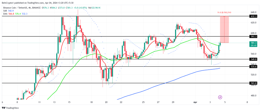 BNB nærmer seg motstandsmerket på $ 593, og å overgå dette nivået kan drive kryptovalutaen utover $ 600. Skulle de diskuterte forholdene holde seg, vil BNB sannsynligvis oppleve en økning, potensielt nå $ 632, og sette nye høyder for året.