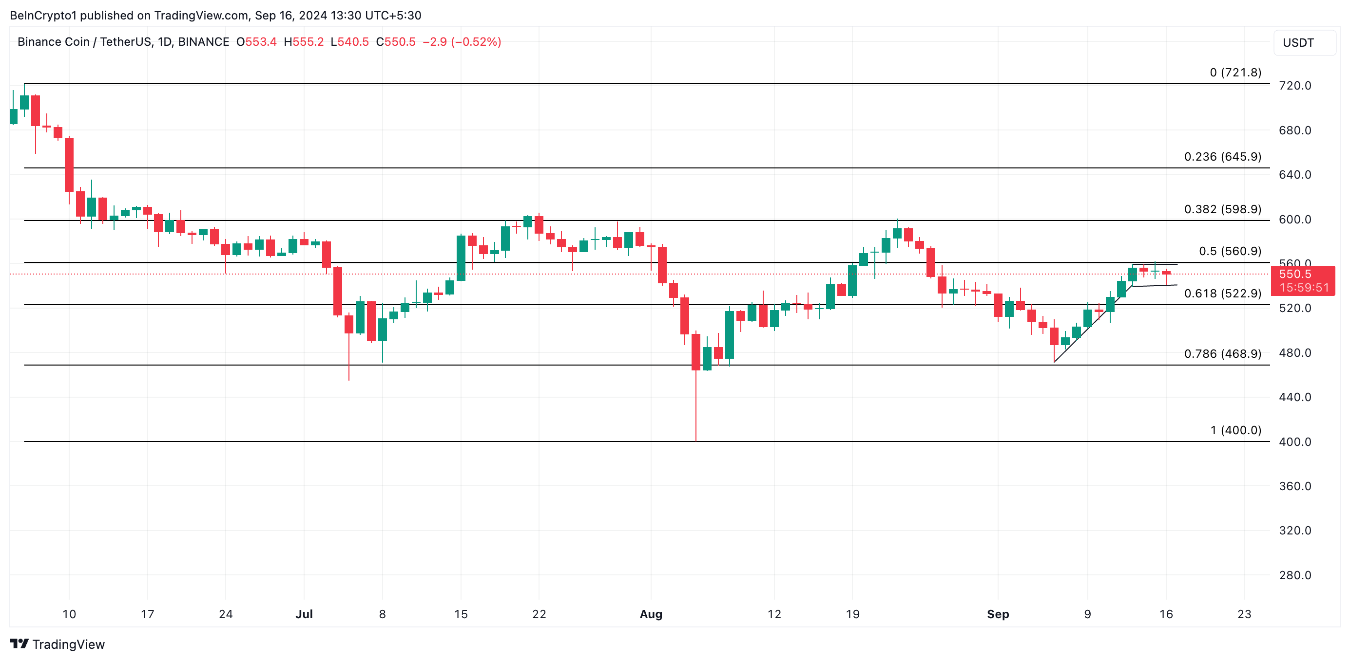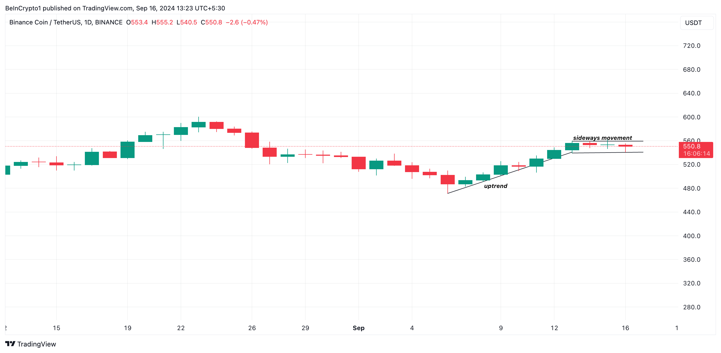 Mellom 6. september og 12. september trendet BNBs pris oppover i et forsøk på å bryte gjennom det langsiktige støttenivået dannet ved $ 560. Imidlertid, siden dette forsøket mislyktes, har myntens pris beveget seg sidelengs uten en sterk oppadgående eller nedadgående trend.