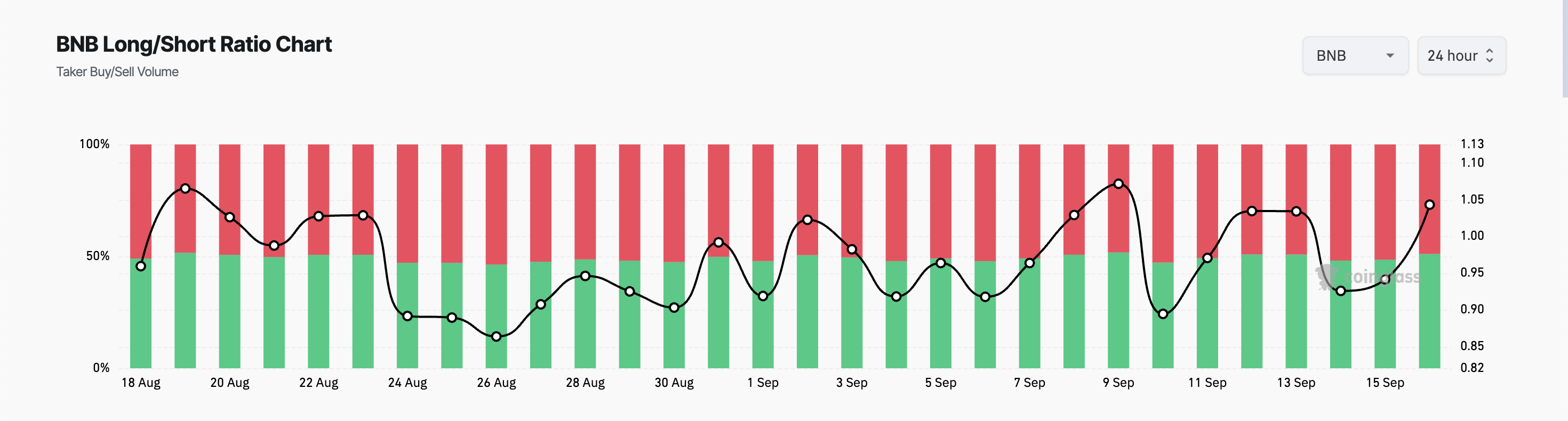 BNBs positive Long/Short-forhold bekrefter den bullish holdningen mot altcoinen. I skrivende stund ligger dette forholdet, som måler investorers stemning, på 1.04.