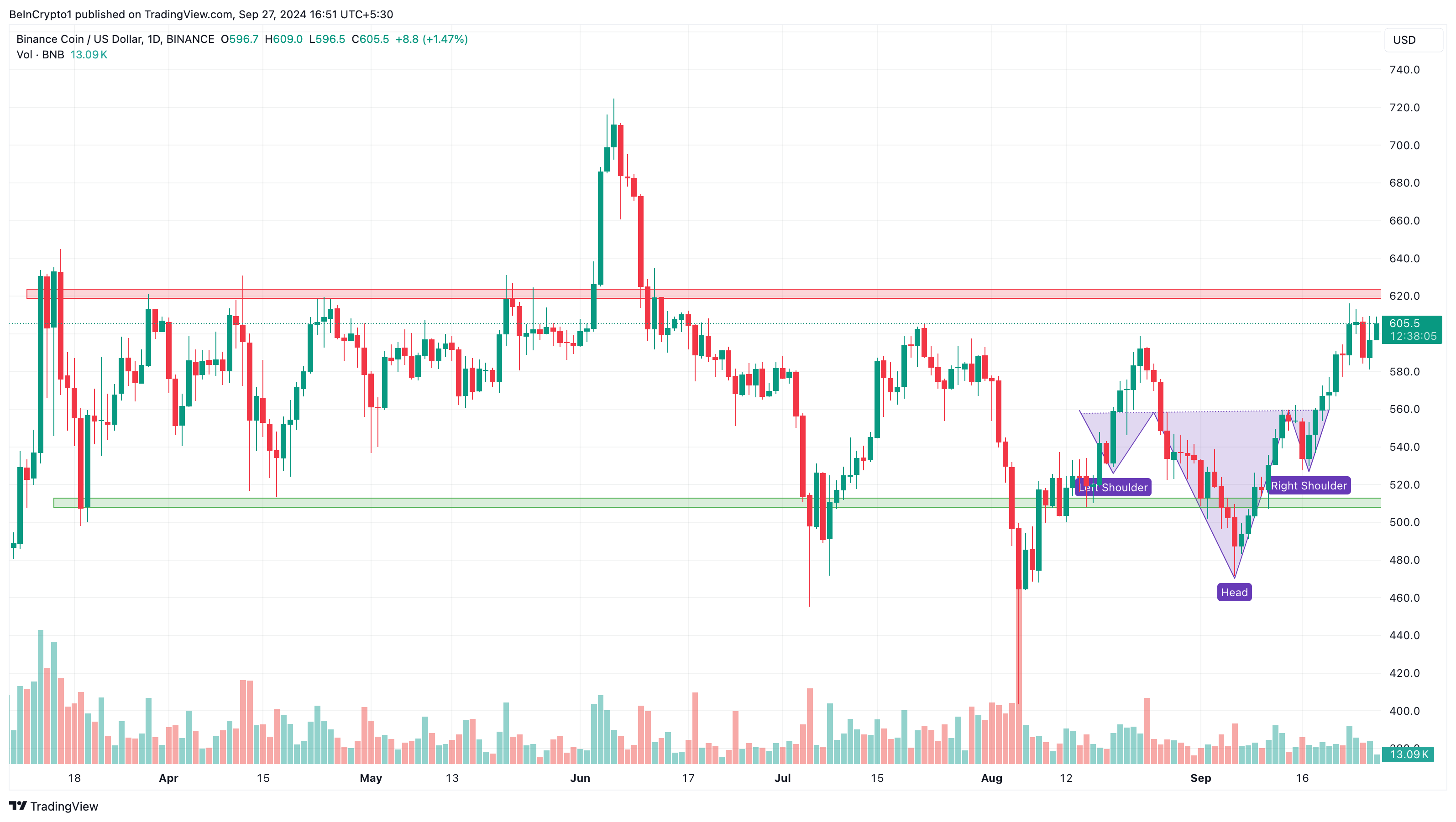 BNBs pris nådde en ny all-time high mens Zhao var i fengsel, og klatret til $ 720 for første gang noensinne. Mynten er for øyeblikket 16 % ned fra den toppen. Imidlertid viser diagrammet nedenfor dannelsen av et invers hode-og-skuldre-mønster. Ved fullføring indikerer mønsteret en bullish reversering fra en nedadgående trend.