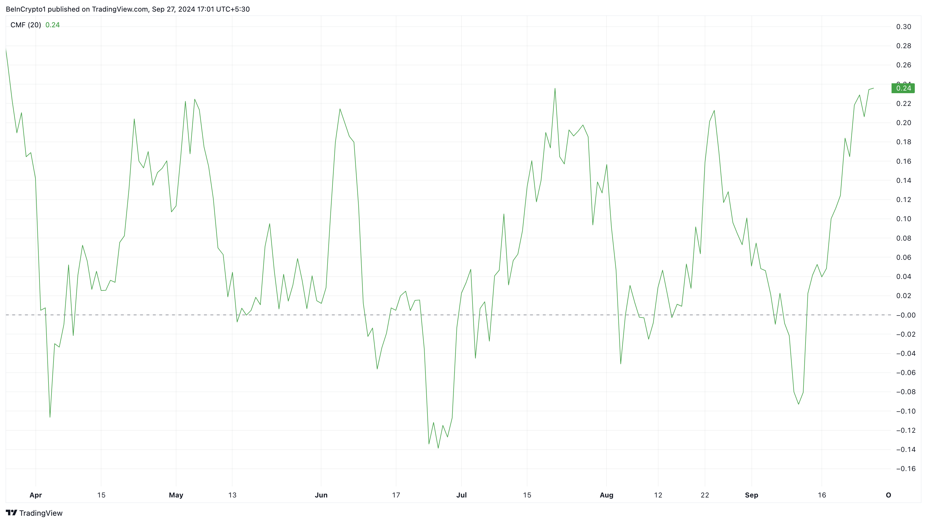 I tillegg er Chaikin Money Flow (CMF)-indikatoren i en oppadgående trend, noe som signaliserer sterkt kjøpepress for Binance Coin (BNB). CMF er et teknisk verktøy som sporer en aktivas nettoakkumulering eller distribusjon. En fallende CMF indikerer ofte salgspress, mens den nylige økningen tyder på at BNB ser økt akkumulering.