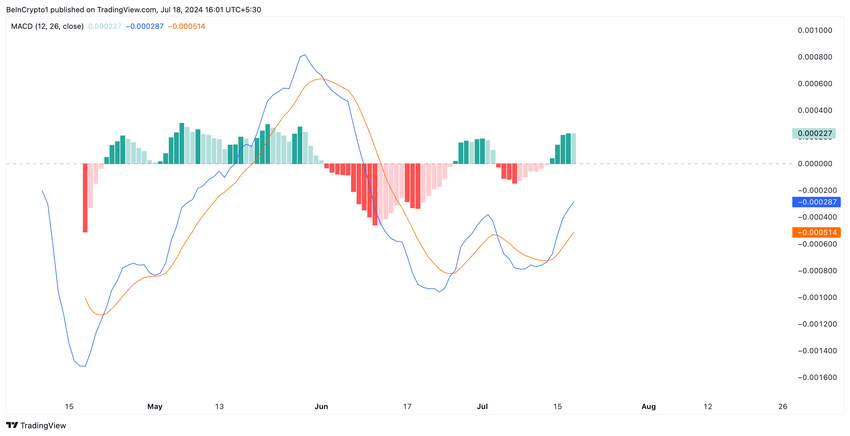 En annen bemerkelsesverdig indikator som fremhever den økende bullish aktiviteten i BOME-markedet er dens glidende gjennomsnittskonvergens/divergens (MACD). På pressetidspunktet hviler BOMEs MACD-linje (blå) over signallinjen (rød) og forsøker å krysse over nulllinjen.