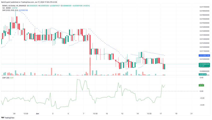 På pressetidspunktet ligger CMF på 0,17. Dette betyr at handelsmenn kjøper BOME-dukkerten. Skulle denne akkumuleringen fortsette, kan BOMEs pris sprette, og et mål på $0,011 kan være sannsynlig.