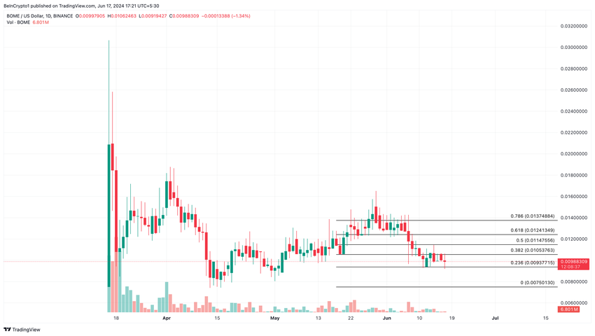 På det daglige BOME/USD-diagrammet posisjonerer Fibonacci-retracementet på 23,6 % på $0,0093. Dermed kan BOMEs pris oppleve en nominell tilbaketrekning til dette nivået på kort sikt.