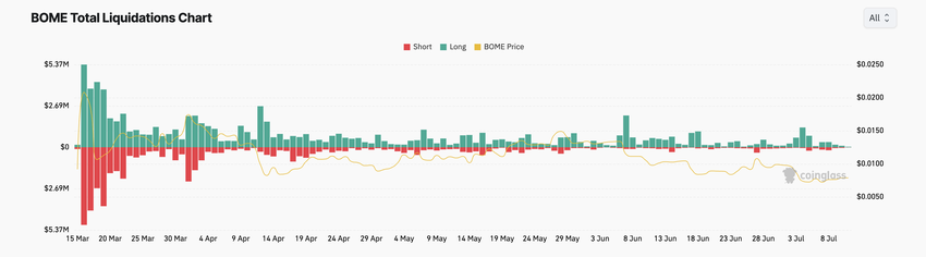 Når en eiendels åpne interesse øker sammen med prisen, bekrefter det ofte styrken og fortsettelsen av opptrenden. Interessant nok, til tross for veksten i BOMEs pris de siste tre dagene, har den registrert flere lange likvidasjoner enn korte.