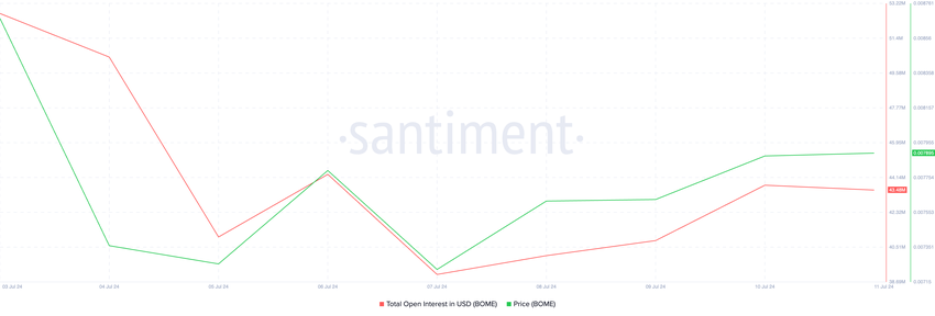 Økningen i BOMEs åpne interesse etter å ha stupt til et hittil lavt nivå hittil i år skyldes veksten i meme-myntens pris som siden har fulgt. Bytte hender på $ 0,0078 i skrivende stund, har BOMEs pris steget med 8% siden 7. Med stigende priser signaliserer oppgangen i tokenets åpne interesse en oppgang i derivatmarkedsaktiviteten.