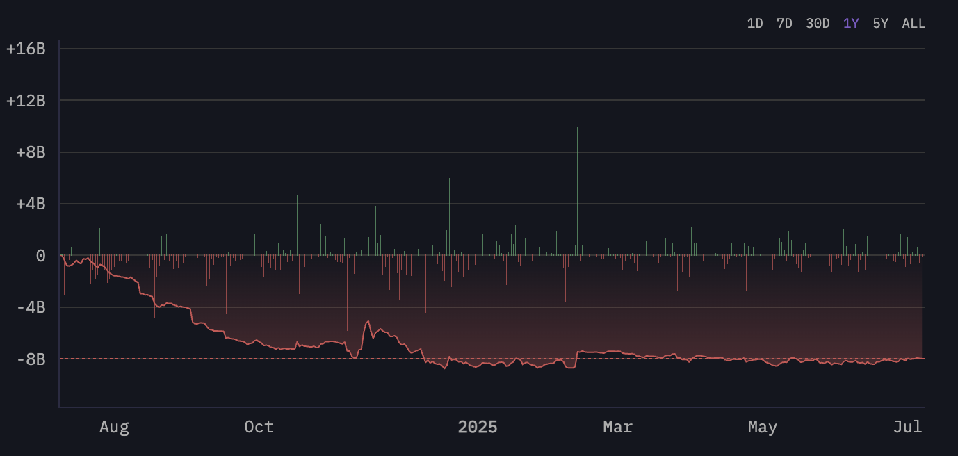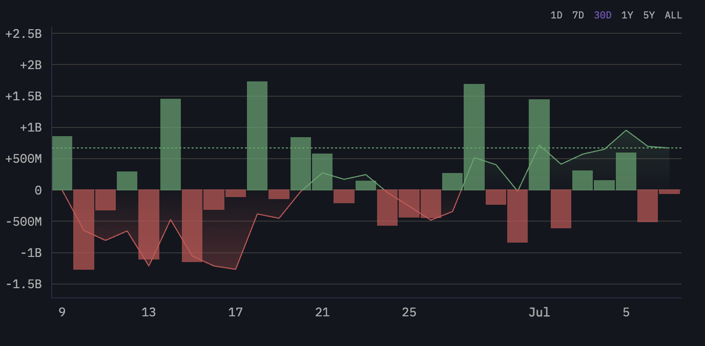 Men når vi zoomer inn på de siste 30 dagene, er trenden mindre aggressiv. Nettoflytene forblir negative, men har stabilisert seg, noe som indikerer nøytral-til-bullish posisjonering i stedet for panikkdrevne utganger.