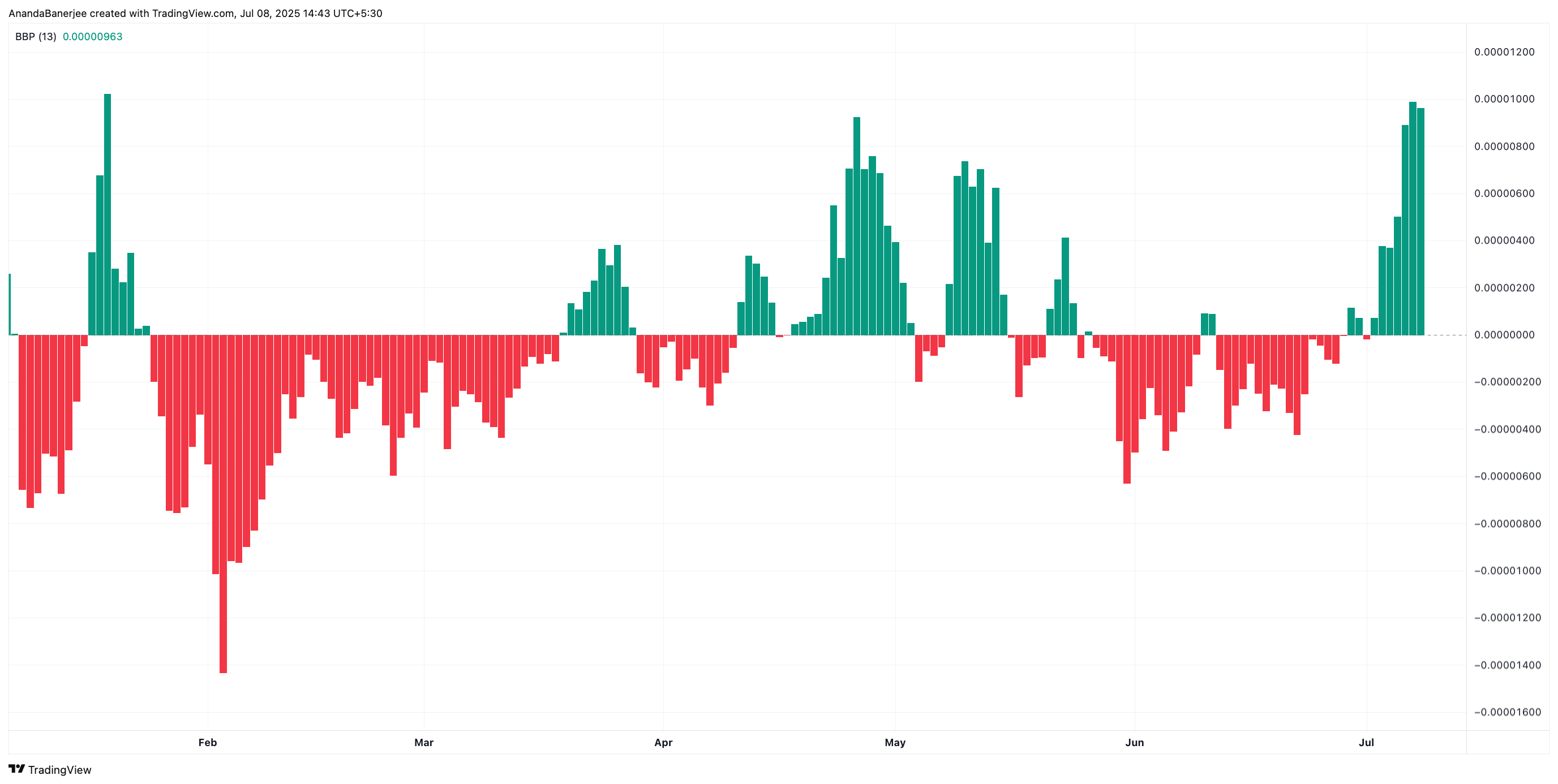 BONKs Elder Ray Index har nettopp snudd til bullish territorium, med bull-kraft som overtar bear-press; et tegn på at kjøperne er tilbake i kontroll.
