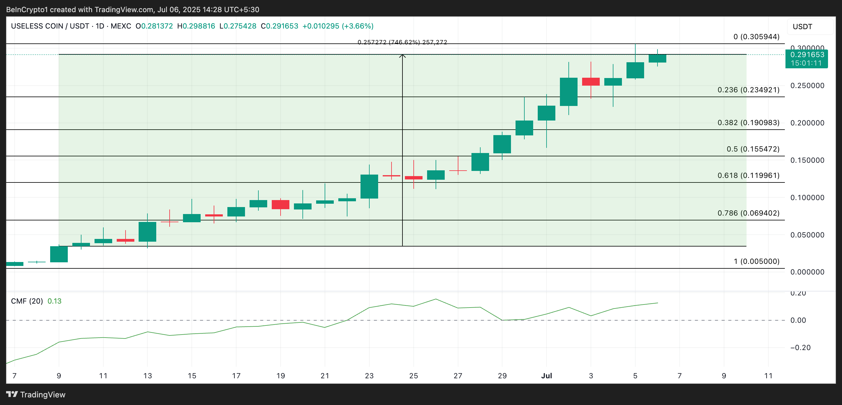 Tokenets stigende Chaikin Money Flow (CMF) bekrefter at USELESS’ prisoppgang støttes av betydelig kjøpspress. Denne momentumindikatoren, som måler hvordan penger strømmer inn og ut av en aktiva, er på 0,13 og stigende.