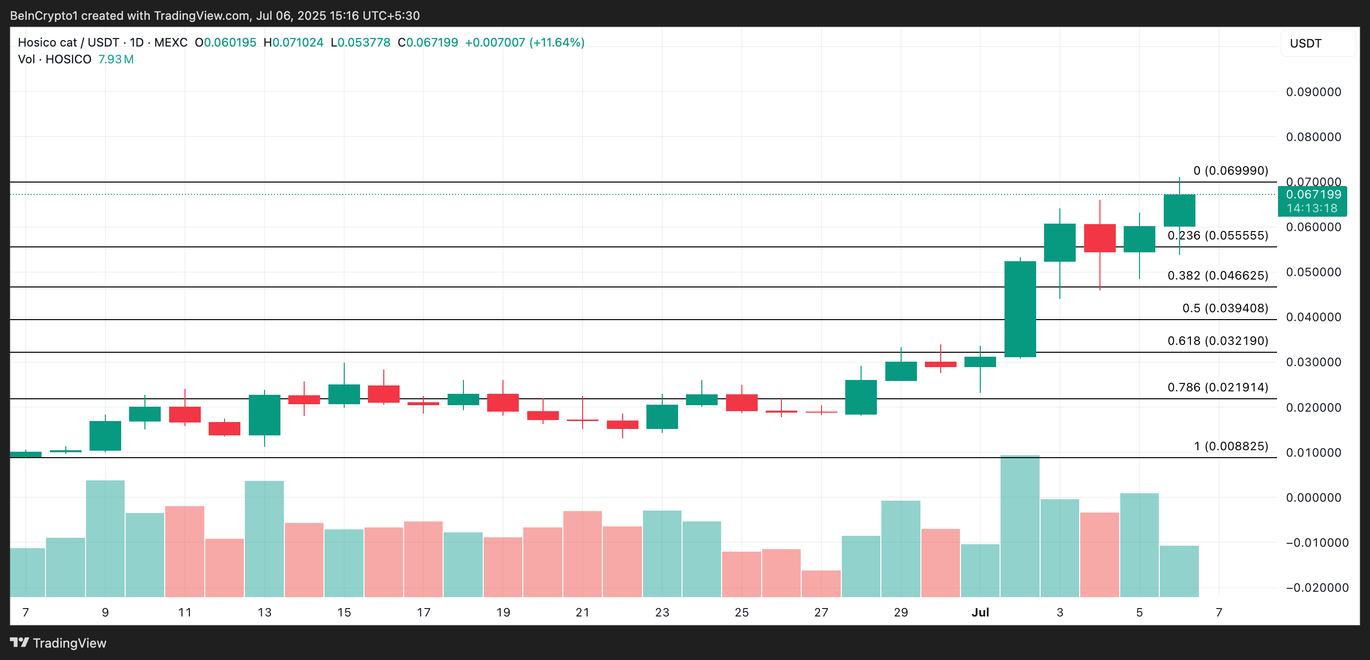 Til tross for det bredere markedets tilbakegang, har HOSICO registrert 16 % gevinster de siste 24 timene. For kontekst har altcoinen kortvarig handlet på en all-time high på $0,069 i løpet av dagens økt.