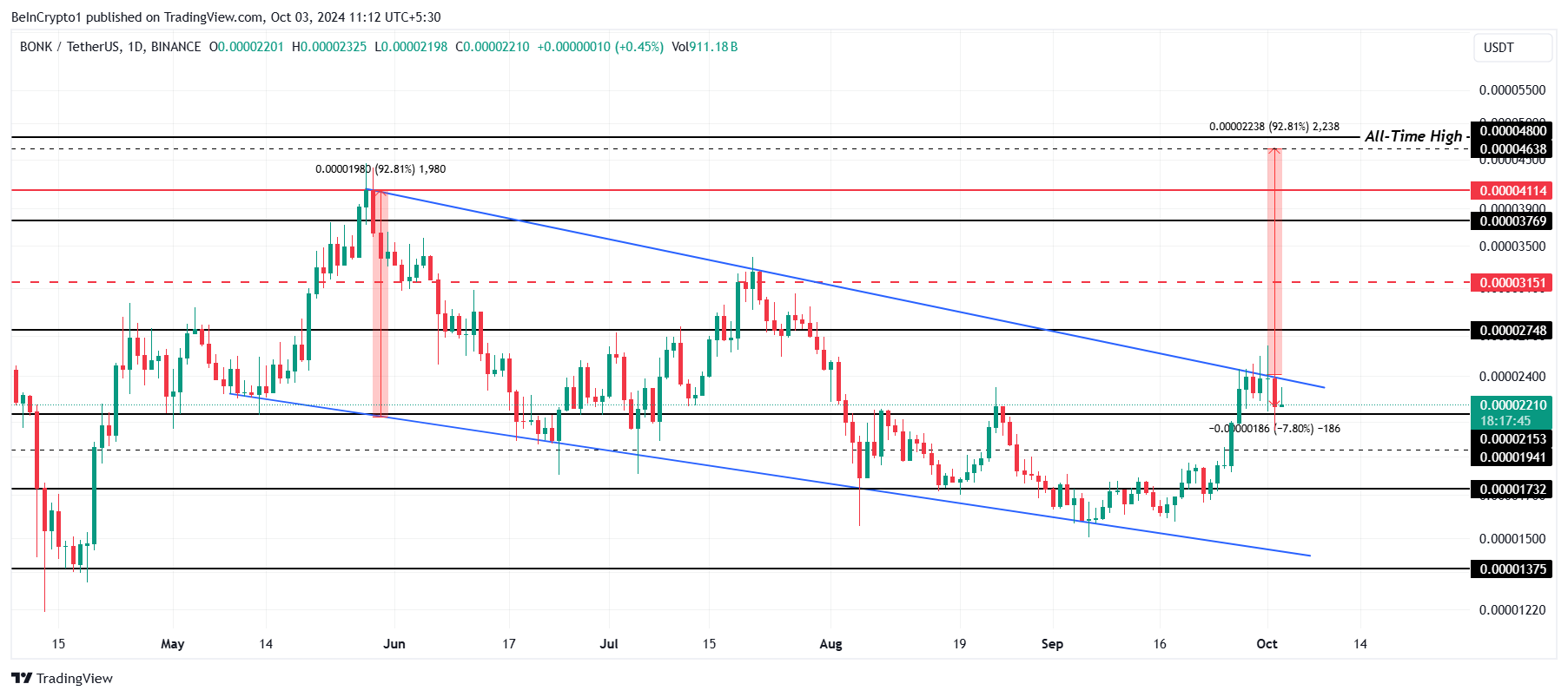 BONK, en Solana meme coin, var på randen av et betydelig gjennombrudd som kunne ha resultert i en 92 % oppgang. Mynten hadde blitt handlet innenfor et bullish mønster, nær et potensielt gjennombrudd som kunne ha drevet prisen mot dens historiske høyde på $ 0,00004800.