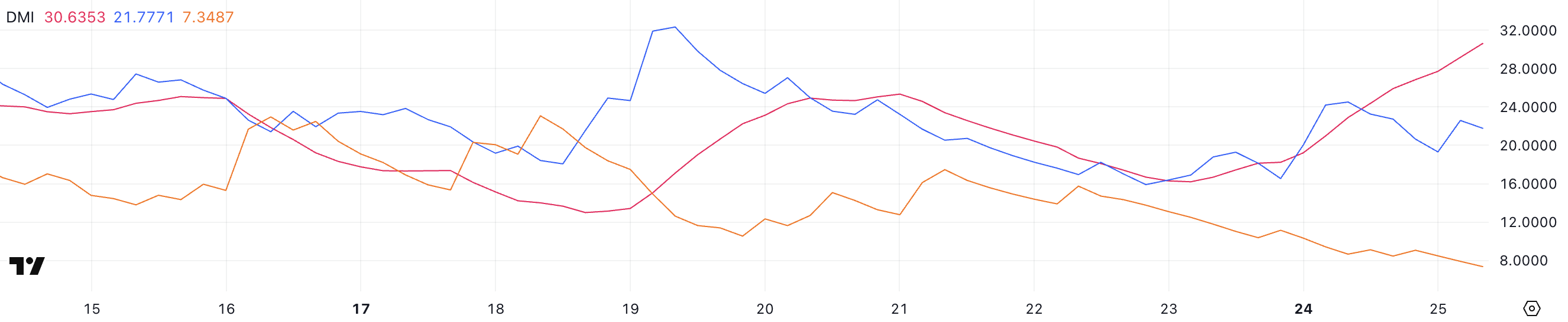 Denne betydelige økningen i ADX antyder at en trend styrkes, og bekrefter at den nåværende prisbevegelsen—enten opp eller ned—vinner momentum. Samtidig er +DI-linjen, som sporer bullish press, på 21,77, litt ned fra 24,5 i går, mens -DI-linjen, som reflekterer bearish press, også har falt fra 8,65 til 7,34.
