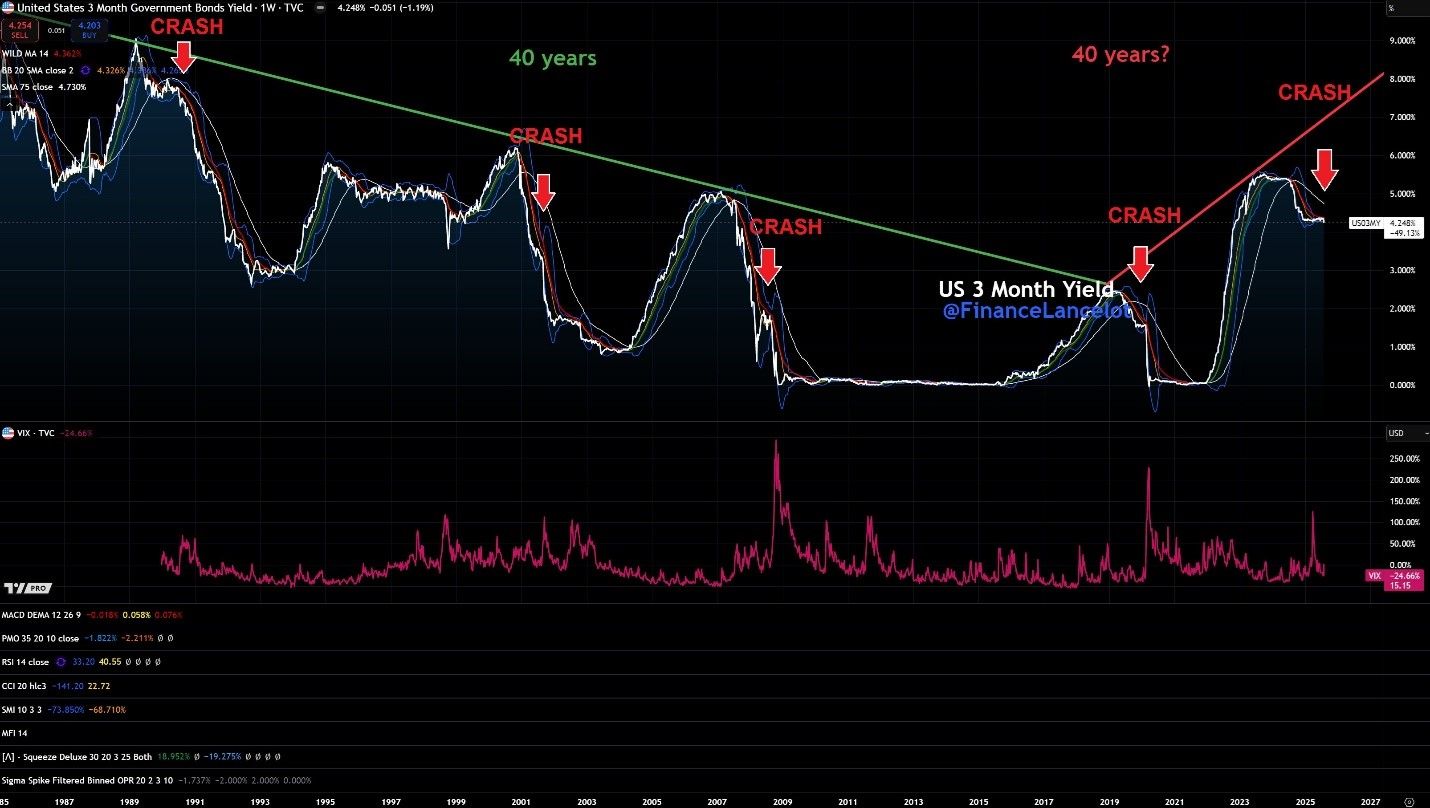Et langsiktig syn på den amerikanske 3-måneders renten avslører en tilbakevendende 40-års trend, med topper som går forut for store markedskrakk. Den siste økningen samsvarer med historiske nivåer før krakk, noe som antyder at syklusen kan gjenta seg igjen i dagens marked.