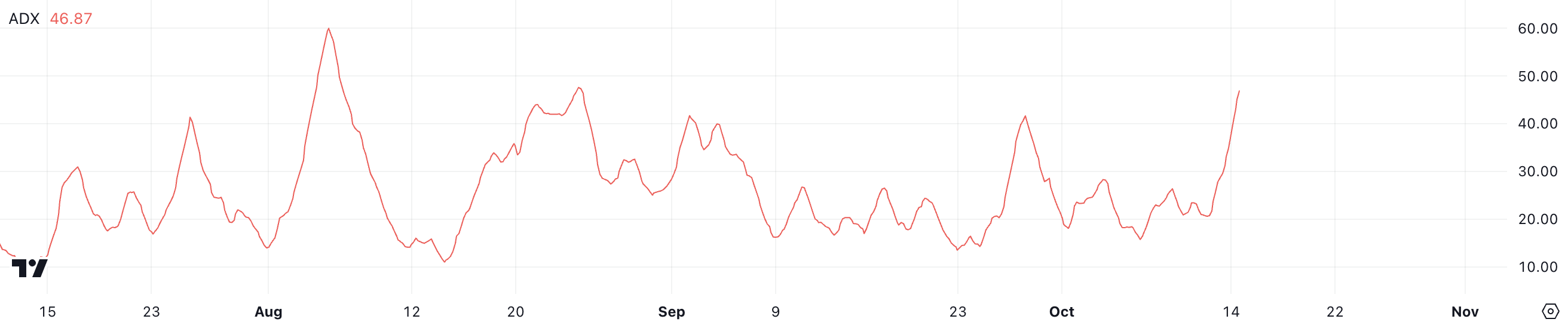 BRETTs ADX (Average Directional Index) ligger for øyeblikket på 46,87, en betydelig økning fra bare 20 for to dager siden. Denne kraftige økningen i ADX indikerer at styrken til den nåværende trenden raskt intensiveres.