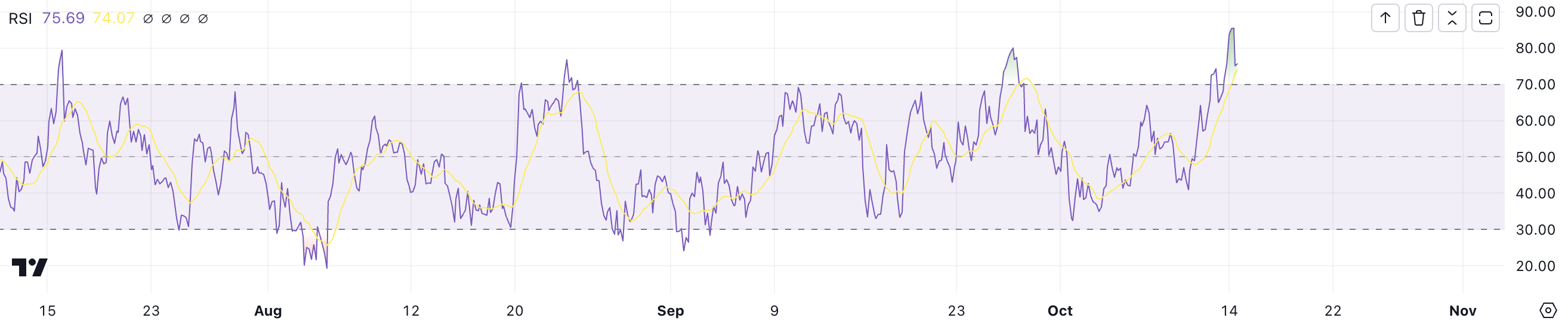 Vanligvis indikerer en RSI under 30 at et aktiva er oversolgt, noe som signaliserer en potensiell kjøpsmulighet. En RSI over 70 antyder at aktivaet kan være overkjøpt, noe som potensielt kan føre til en pris korreksjon.