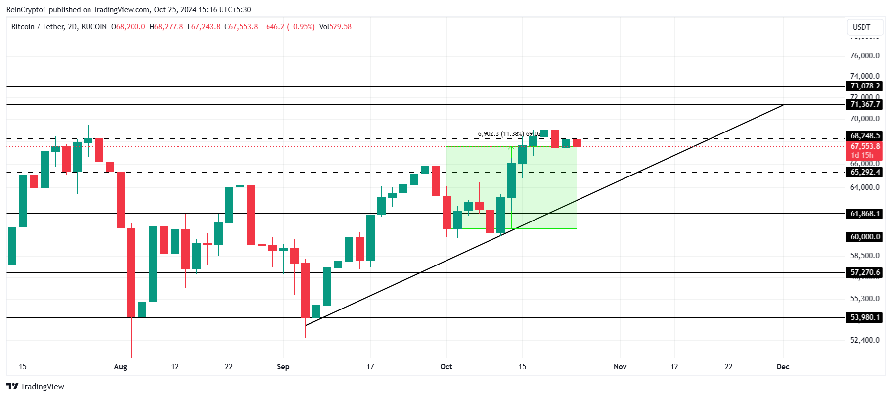 Bitcoin handles for øyeblikket til $ 67 553, med anstrengelser for å lukke over $ 70 000-merket pågående de siste ti dagene. Å sikre $ 68 248 som støttenivå er avgjørende for at BTC skal bevege seg mot neste motstand på $ 71 367, et nivå som kan bestemme veien til en ny høyde.