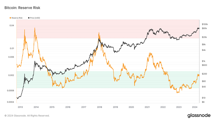 Potensialet for det samme er også synlig på Reserve Risk-indikatoren. Denne indikatoren måler tilliten til langsiktige Bitcoin-innehavere ved å vurdere forholdet mellom pris og HODLer, noe som indikerer potensielt salgs- eller kjøpspress basert på tidligere akkumuleringsmønstre.