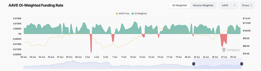 Den overveiende positive finansieringsraten som siden har fulgt AAVE viser at de fleste nye tradere har åpnet lange posisjoner. Dette er et bullish signal, da det betyr at det er flere tradere som satser på en fortsatt prisrally.