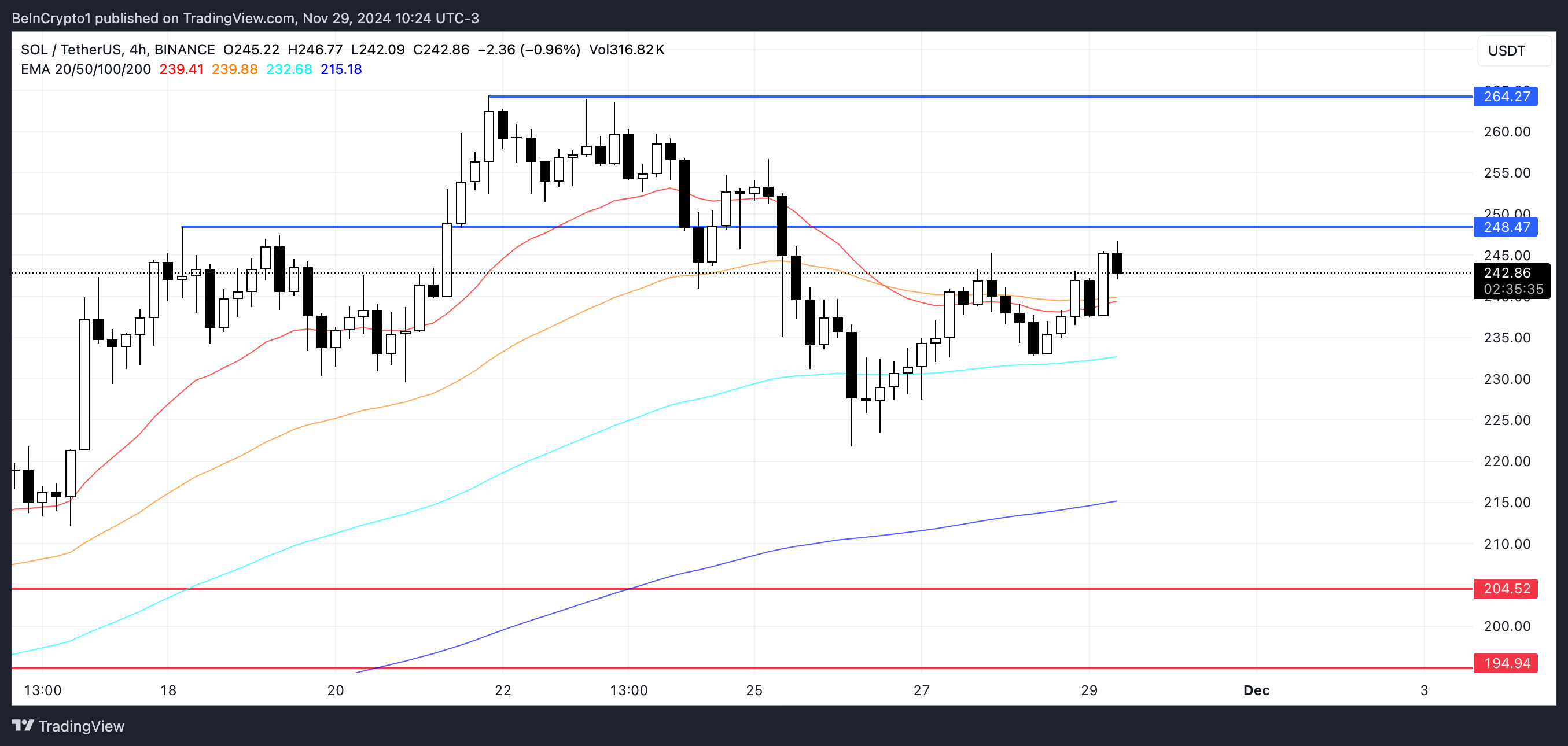 SOL kurs nådde en ny all-time high 22. november før den gikk inn i en korreksjonsfase, men dens momentum den siste måneden forblir imponerende, med en økning på 38 %. Denne veksten overgår litt Bitcoins 35 % økning i samme periode.
