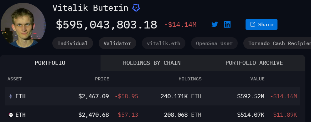 Til tross for disse transaksjonene, eier Buterin fortsatt en betydelig mengde Ethereum. Ifølge Arkham Intelligence-dashbordet eier han for øyeblikket omtrent $ 592 millioner verdt av ETH.