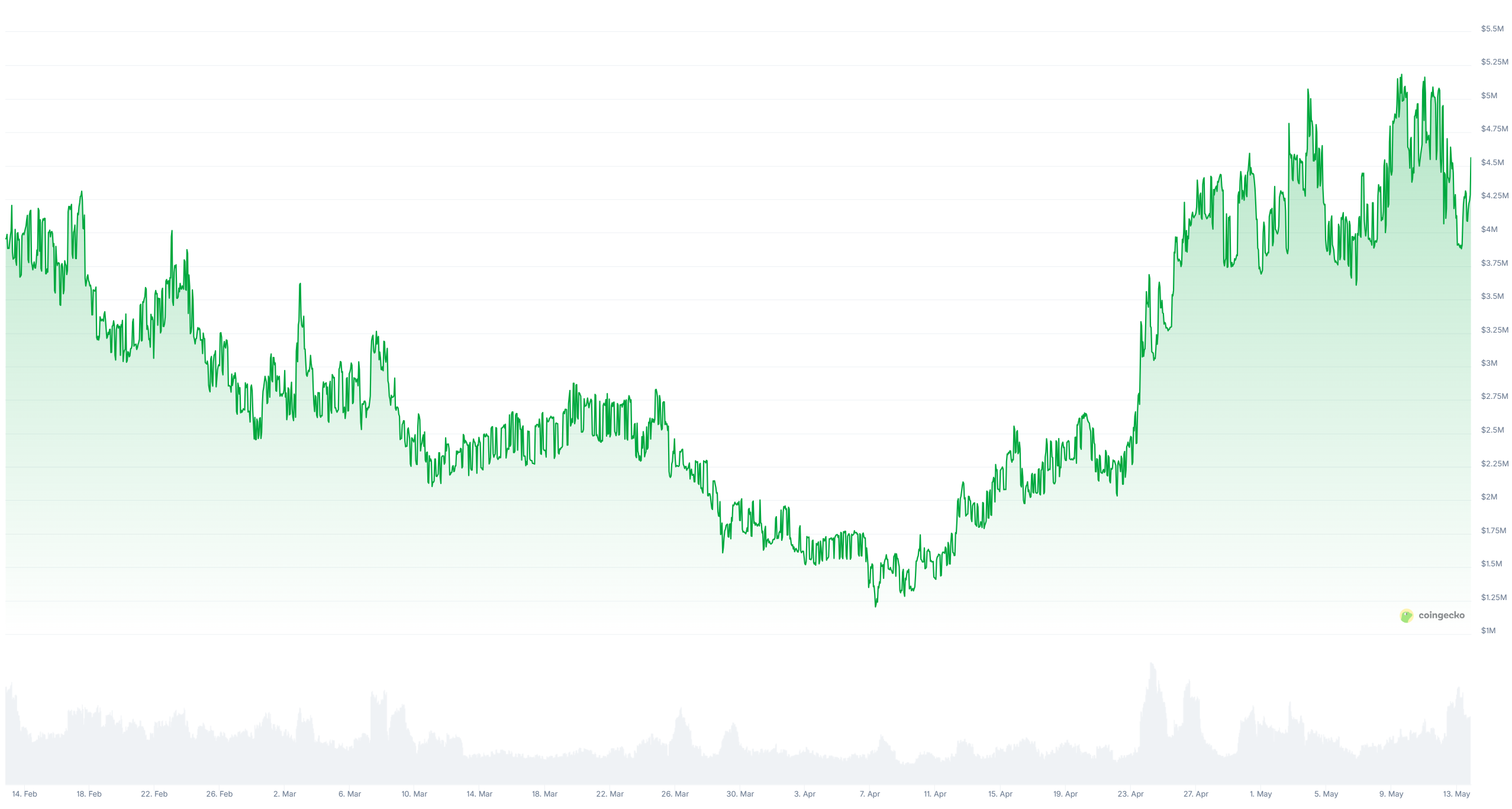 Den meme coin har prestert godt de siste to månedene, med korte nedgangsperioder men raske oppganger. I dag har BYTE en markedsverdi på over 4 millioner. Hvis denne AI-til-AI meme coin-trenden øker, kan BYTE være blant de største fordelene.