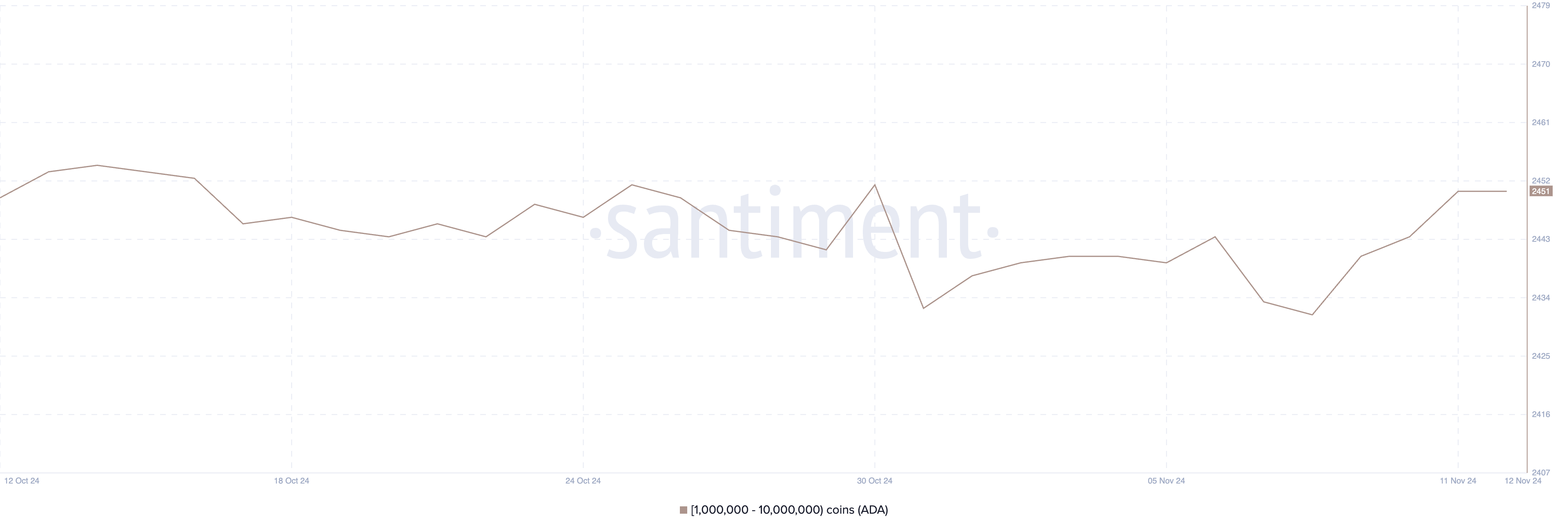 Antallet adresser som holder mellom 1 000 000 og 10 000 000 ADA forble stabilt fra oktober til tidlig i november, men begynte å vokse igjen 8. november.