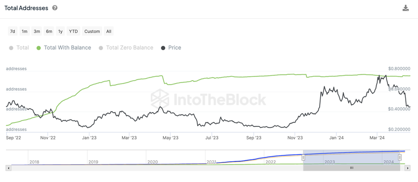 Adopsjonsraten for ADA har vist positive trender. Til tross for svingninger i pris, tyder den konsekvente økningen i nye adresser på en sunn tilstrømning av nye brukere. Dette er et positivt tegn for den langsiktige veksten og stabiliteten til Cardano-nettverket.