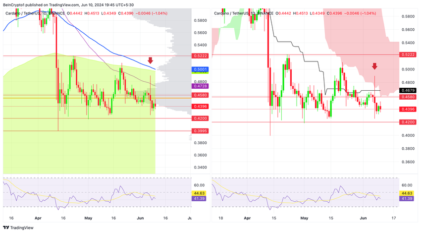 I forsøket på å nå 0,48 dollar gikk Cardano inn i Ichimoku-skyen og ble deretter avvist, noe som signaliserer et nytt bearish teknisk perspektiv.