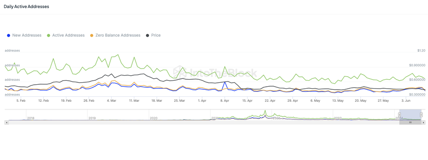 Nye adresser så en kraftig nedgang 9. juni, og falt med 5 254. Mens aktive adresser nådde en topp 3. juni før de falt med 6 840 den 6. juni. Nullbalanseadresser viste også volatilitet, med et betydelig fall på 5 198 den 9. juni.
