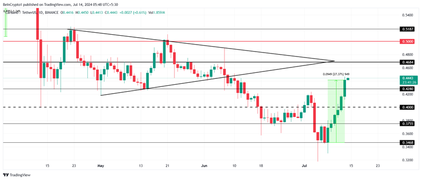 Etter en eksplosiv økning på 27 % i løpet av uken, kan Cardanos pris finne litt motstand i å fortsette rallyet. ADA handles til $0,44 i skrivende stund, og kan neste gang teste støtten til $0,42.
