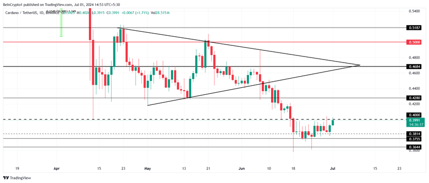 Cardanos pris falt ut av en bullish symmetrisk trekant for en måned siden i begynnelsen av juni. Siden den gang har trekningen sørget for at ADA nå handles under $0,40. Som et resultat handles tredje generasjons altcoin nå under $0,40.