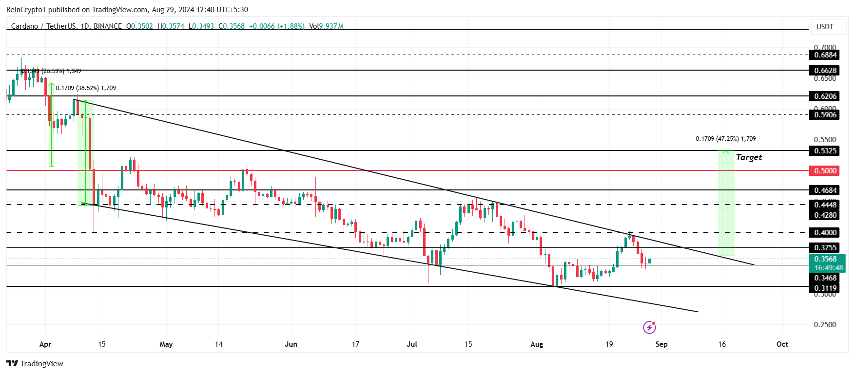 Cardanos pris på $ 0,35 kan ende opp med å møte problemer og potensielt til og med mislykkes i å bryte ut av den nedadgående kileformasjonen. Dette mønsteret antyder at en 47 % rally er på kortene ved utbrudd, og setter målet til $ 0,53.
