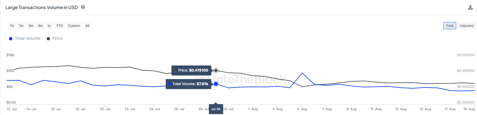 I tillegg til bekymringene er den merkbare nedgangen i aktivitet blant store lommebokholdere eller krypto hvaler. I løpet av den siste måneden har transaksjonsvolumet til disse store holderne falt med 32 %, fra $ 7,81 milliarder til $ 5,26 millioner. Denne reduksjonen i aktivitet fra krypto hvaler reflekterer en nedgang i interesse og kan ytterligere negativt påvirke ADAs pris.