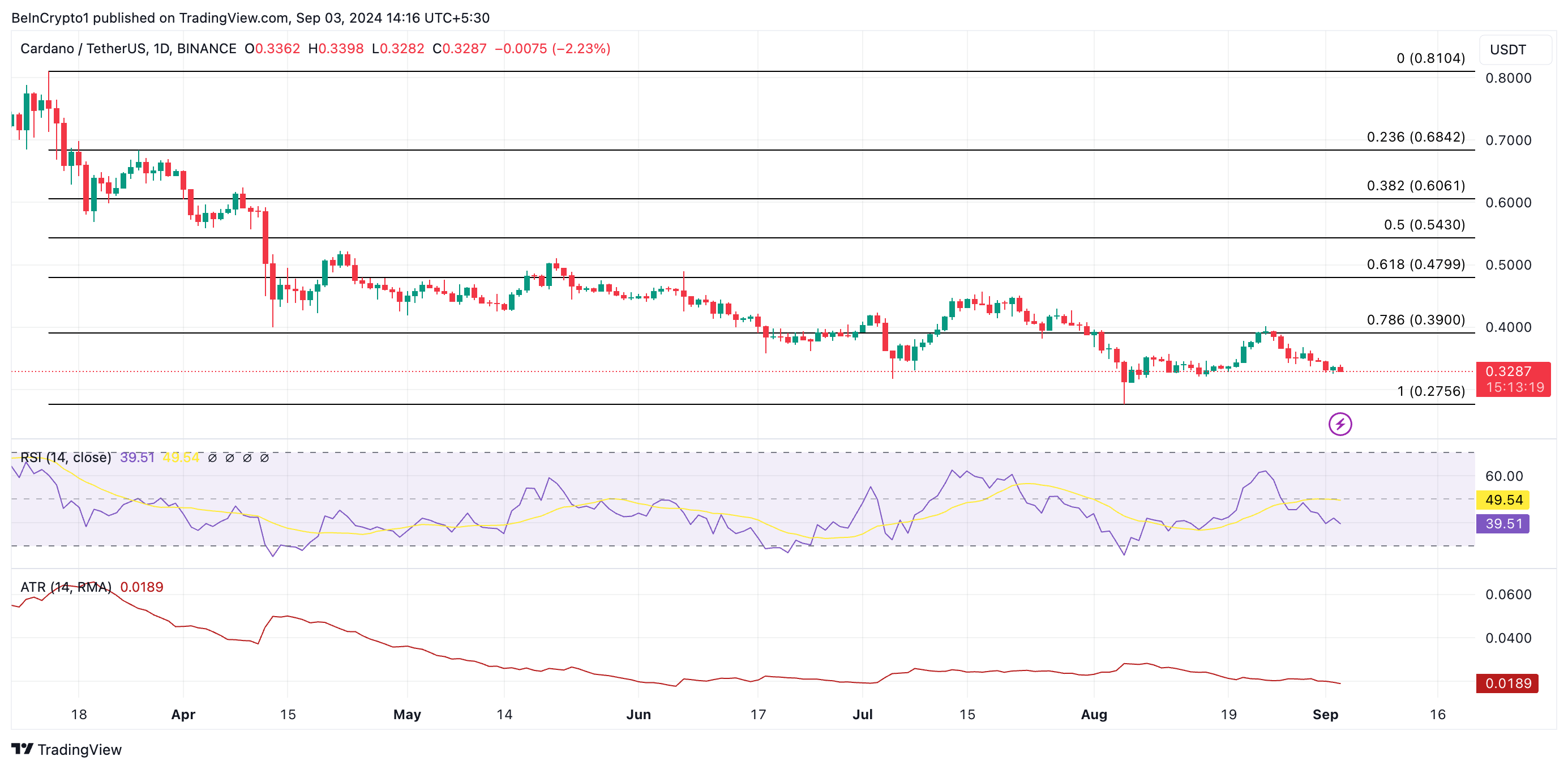 Mens markedet venter på en katalysator, kan en økning i bullish momentum drevet av økt etterspørsel etter ADA skyve prisen mot $0,39. Men hvis bearish press øker, kan altcoinens pris stupe til sitt laveste nivå 5. august på $0,27.