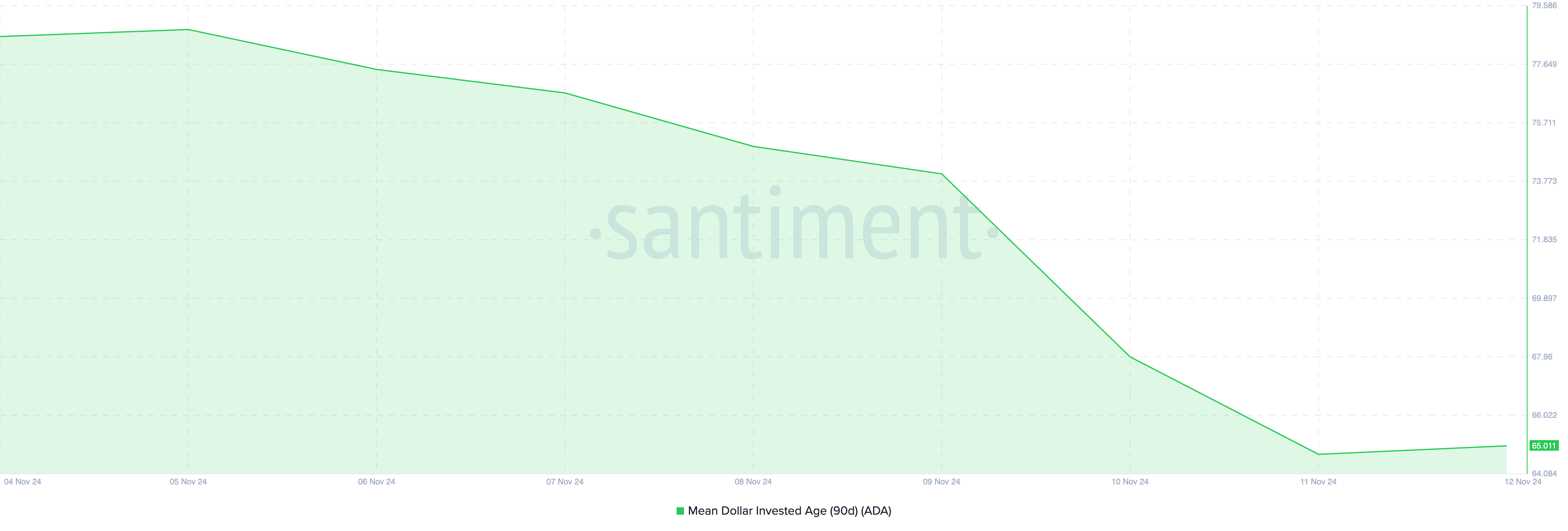 En annen måling som tyder på at Cardanos oppgang ikke er over, er Mean Dollar Invested Age (MDIA). MDIA er gjennomsnittsalderen på hver dollar investert i en kryptovaluta.
