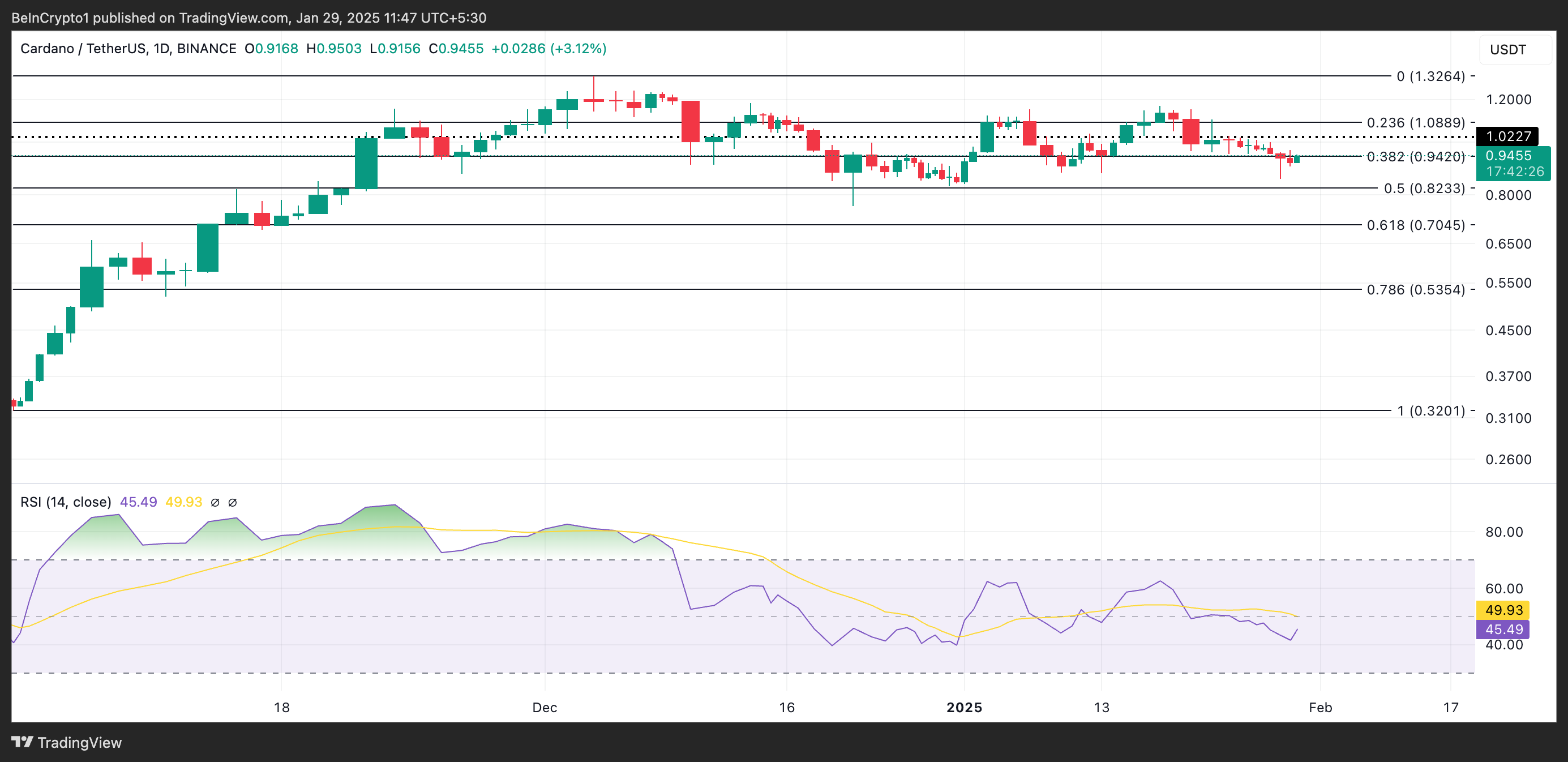 ADAs fallende Relative Strength Index (RSI) på det daglige diagrammet bekrefter økningen i salgsaktivitet. I skrivende stund står dette under 50-senterlinjen på 45,49.