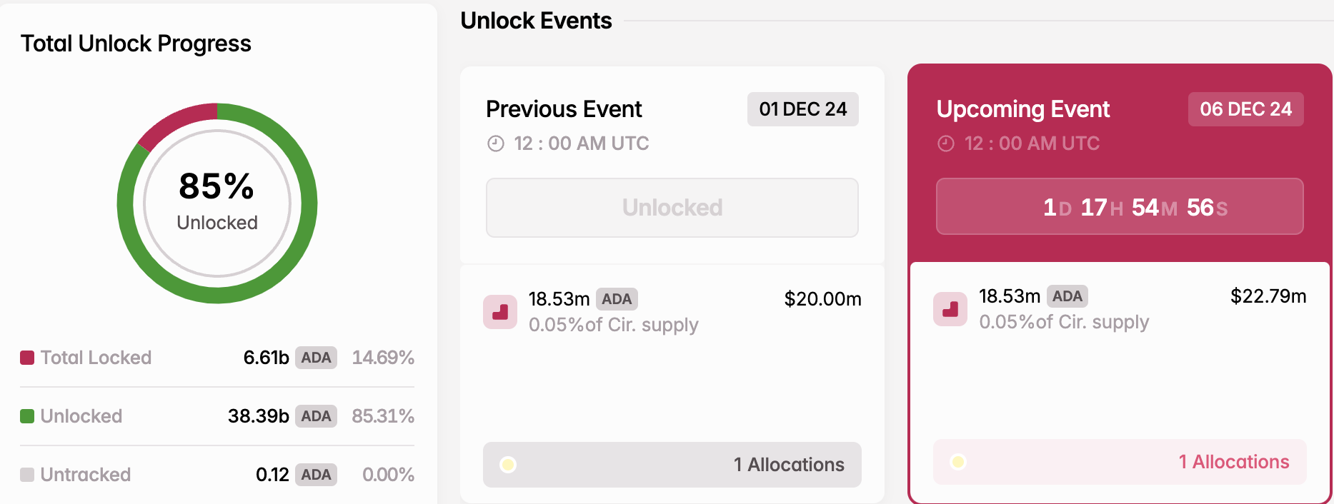 Ifølge Tokenomist (tidligere Token Unlocks), er Cardano satt til å frigjøre 18,53 millioner ADA på den datoen, verdsatt til $ 22,79 millioner. Dette forventede tilbudssjokket kan introdusere volatilitet, potensielt hindre altcoinens evne til å opprettholde en opptrend i denne perioden.