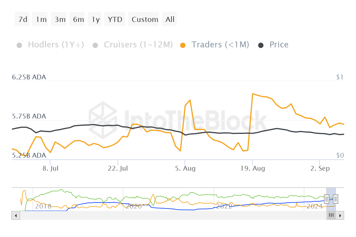 Den store konsentrasjonen av ADA holdt av kortsiktige investorer øker risikoen for et raskt salg. Dermed fortsetter det makro-momentumet, drevet av kortsiktige markedsdeltakere, å tynge tungt på ADAs utsikter.