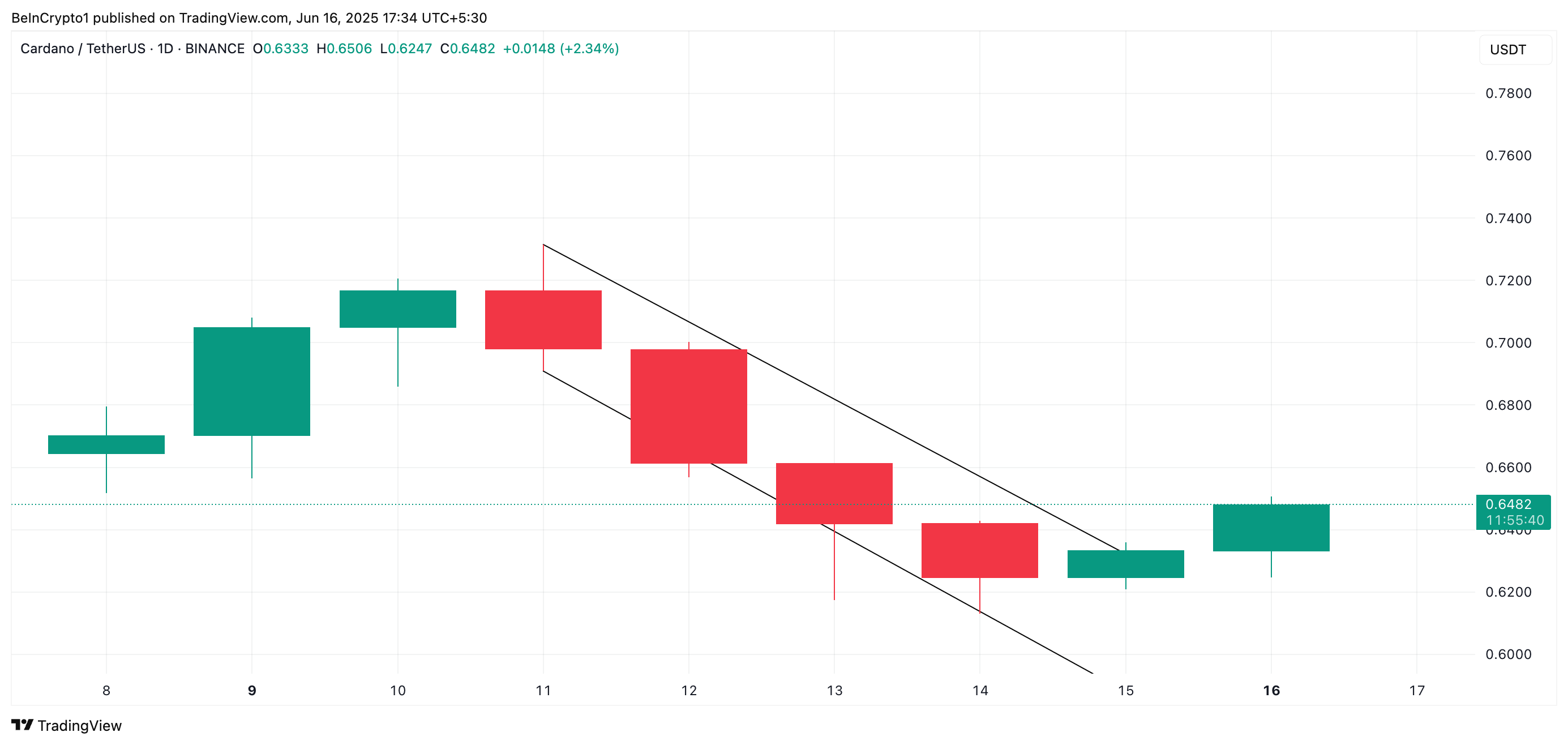 ADAs 3 % oppgang det siste døgnet har presset prisen over den fallende kanalen som holdt prisen i en nedadgående trend mellom 11. og 15. juni.