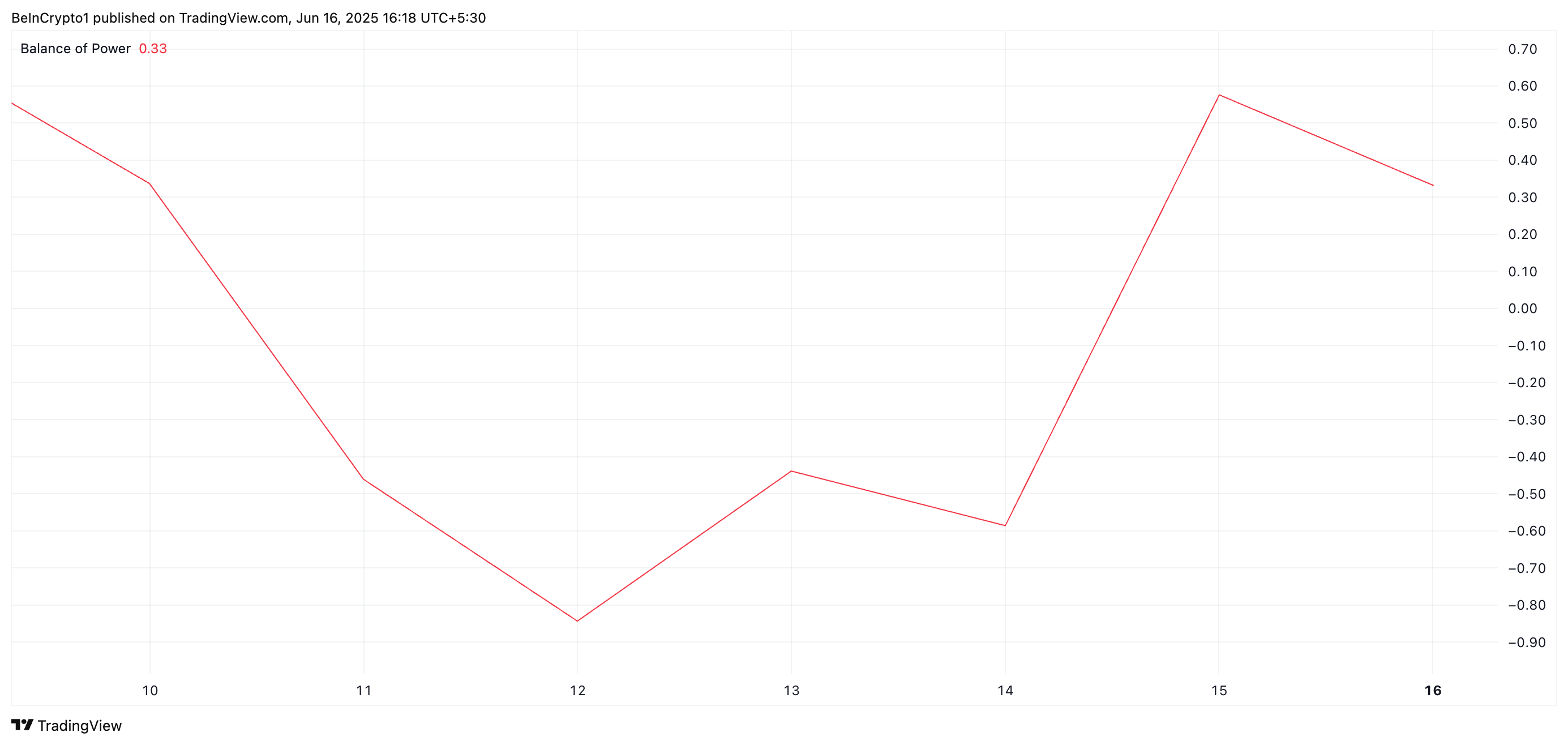 BoP-indikatoren måler styrken til kjøpere versus selgere i markedet, og hjelper til med å identifisere momentumskift. Når dens verdi er positiv, er kjøpere i kontroll over markedet og driver nye prisøkninger.