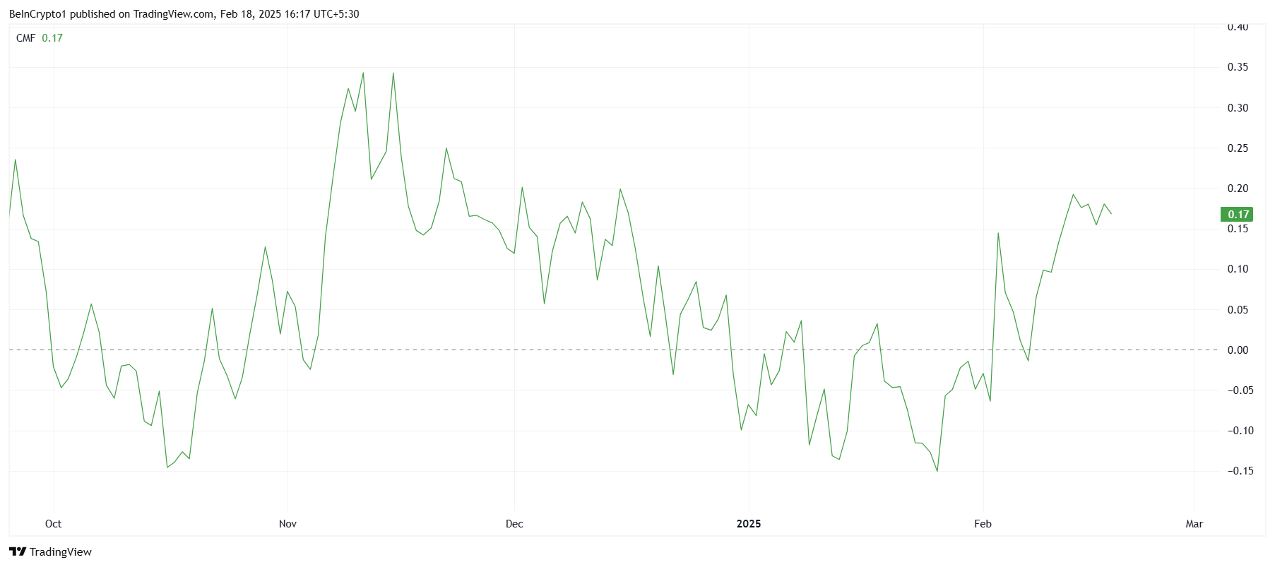Cardanos makro momentum ser også lovende ut, med tekniske indikatorer som støtter bullish forventninger. Chaikin Money Flow (CMF) har steget kraftig siden begynnelsen av måneden. Dette betyr at tradere blir mer villige til å investere i aktiva. Økningen i CMF antyder også en sterk etterspørsel etter Cardano, som forventes å fortsette.