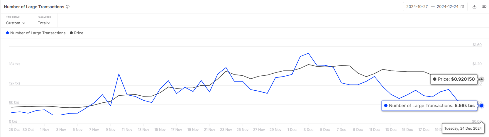 Nedgangen i transaksjoner med høy verdi til 5560 transaksjoner i løpet av de siste 24 timene samsvarer med ADAs mangel på vekst de siste dagene. Store investorer ser ut til å vente på sterkere signaler om oppgang før de går inn i markedet igjen, noe som ytterligere demper Cardanos utsikter for en kortsiktig oppgang.