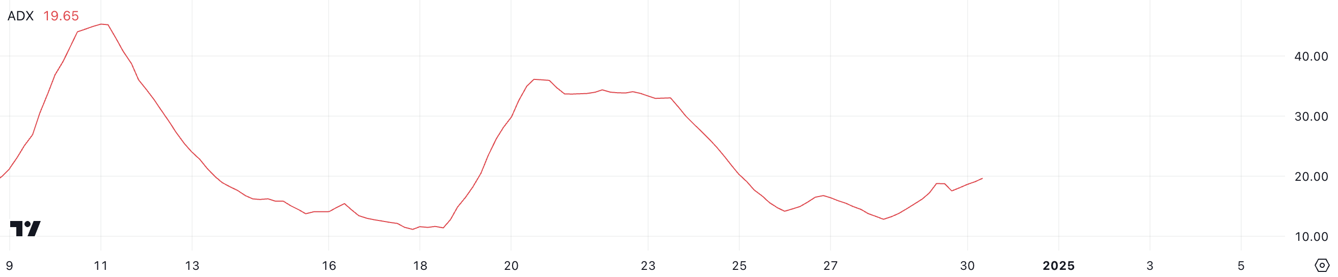 Average Directional Index (ADX) måler styrken av en trend, enten oppadgående eller nedadgående, på en skala fra 0 til 100. Verdier over 25 indikerer en sterk trend, mens avlesninger under 20 antyder svak eller ikke-eksisterende trendstyrke. Med ADAs ADX nå på 19,65, peker indikatoren på en potensiell overgang fra en periode med svak trendaktivitet.