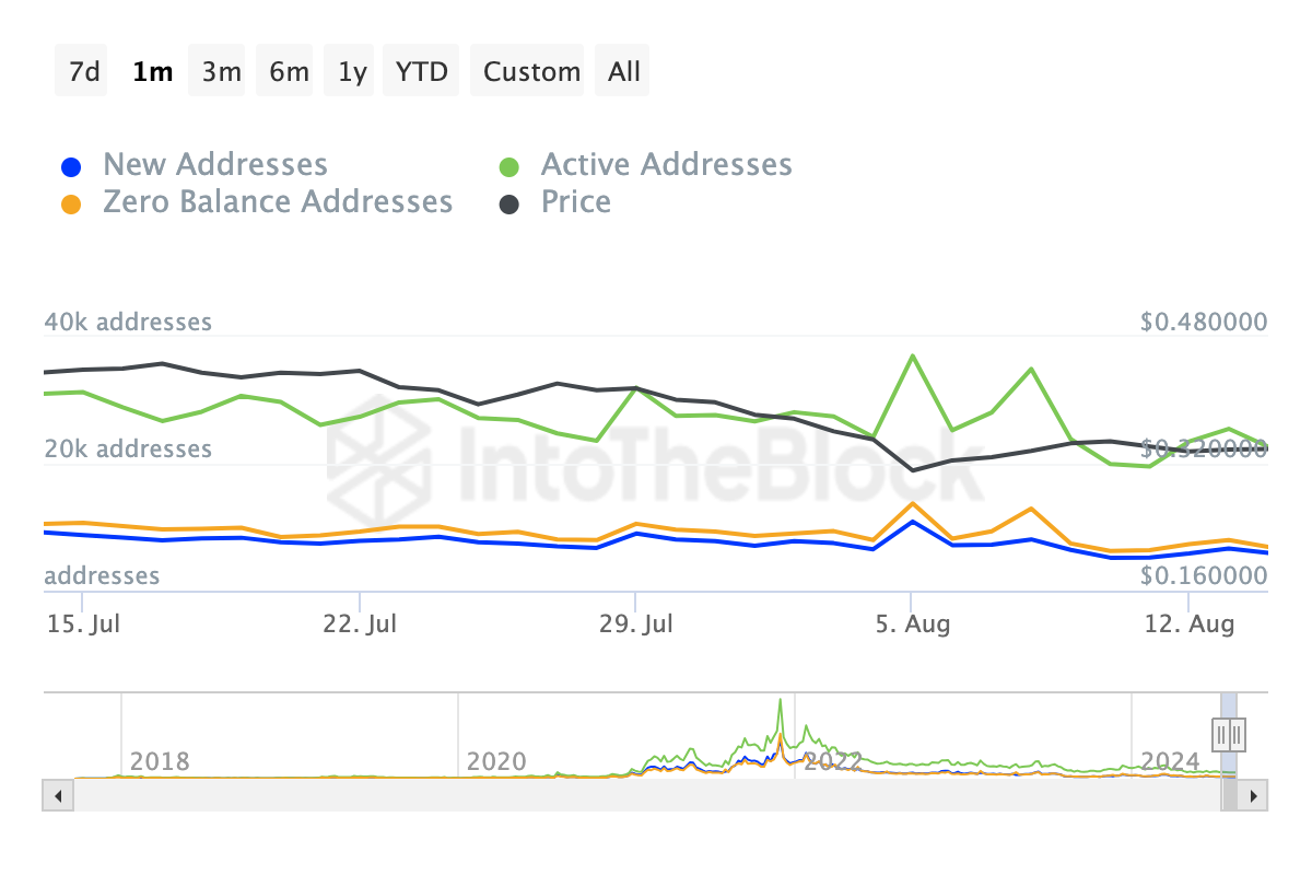 Fra et kortsiktig perspektiv dannet ADA en bearish pennant mellom midten av juli og tidlig i august. Dette mønsteret kjennetegnes av et skarpt prisfall etterfulgt av konsolidering innenfor en symmetrisk trekant på det daglige diagrammet.