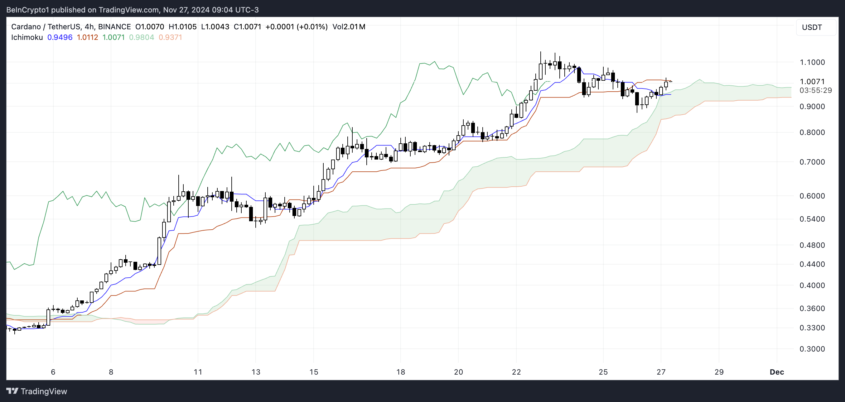 Imidlertid antyder indikatorer som Ichimoku Cloud og ADX en mulig trendvending. Hvis opptrenden bryter ned, kan ADA kurs møte en kraftig korreksjon, potensielt falle til $ 0,51, noe som representerer en nedgang på 49 % fra dagens nivåer.