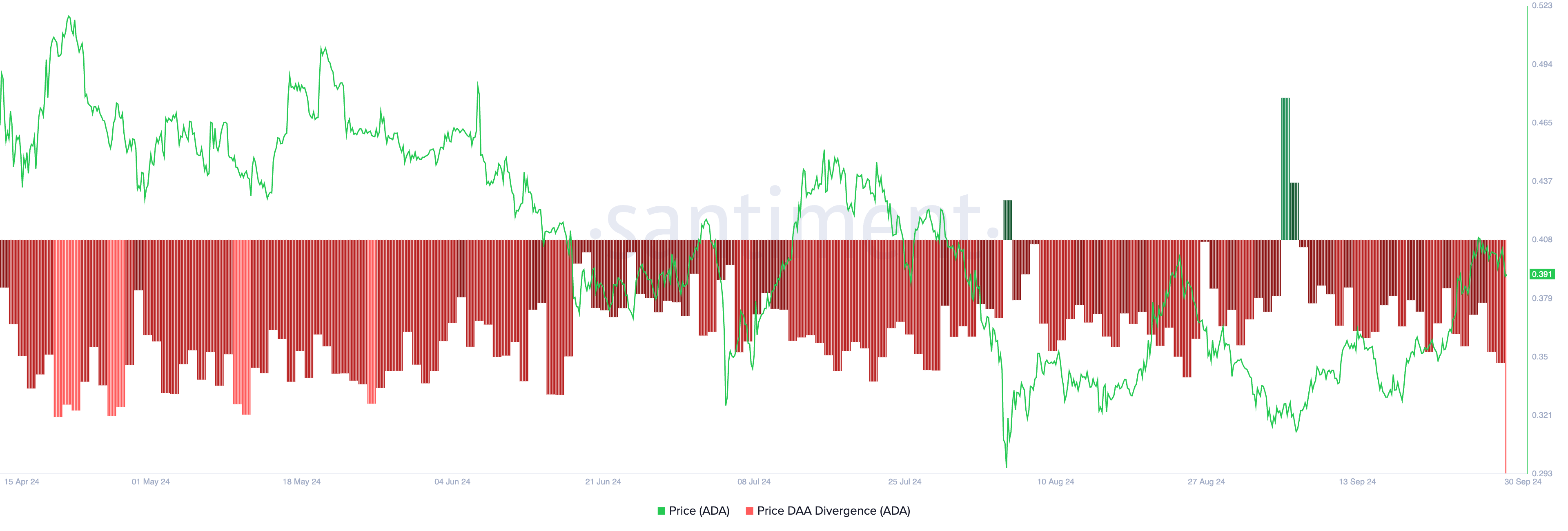 I tillegg bekrefter de negative lesningene fra Cardanos daglige aktive-adresse (DAA) divergens den reduserte etterspørselen etter altcoinen. Denne metrikken, som måler en aktivas prisbevegelser med endringene i antall daglige aktive adresser, er på -43,3 % i skrivende stund.