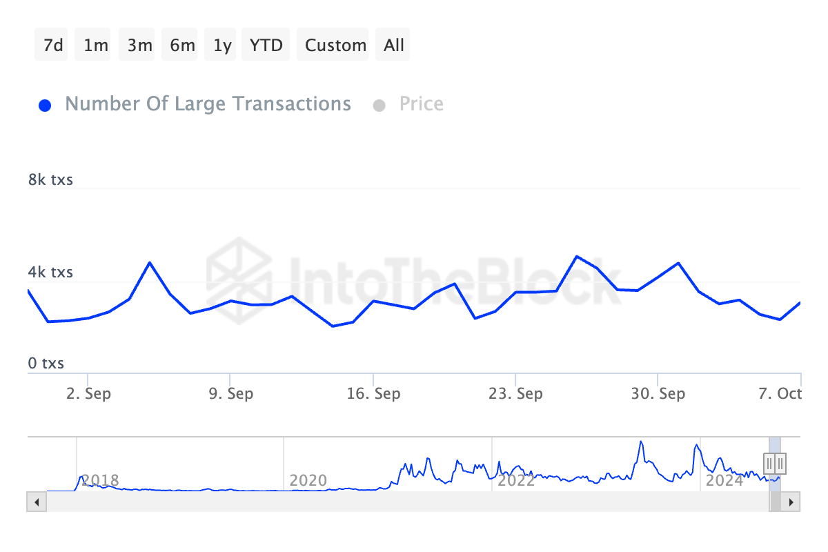 Men etter denne toppen begynte antallet store transaksjoner å avta jevnt, og falt til 2 300 den 6. oktober og gjenopprettet seg noe til 3 000 innen 7. oktober. Denne nedgangen i høyverdige on-chain aktiviteter kan indikere en avkjølingsperiode.