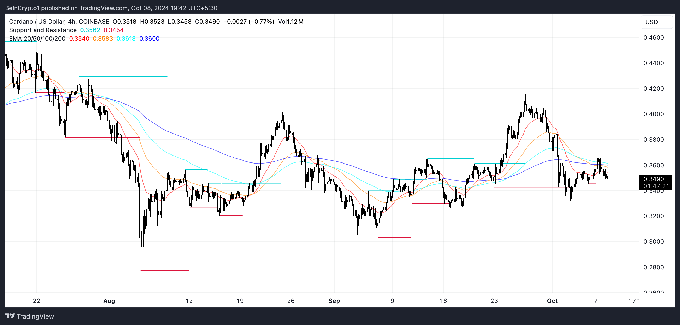 ADAs prisdiagram viser for øyeblikket en mild nedadgående trend, selv om den ikke er spesielt sterk, ettersom EMA-linjene forblir svært nær hverandre. Denne nærheten mellom linjene antyder at ADA kan være i ferd med å gå inn i en konsolideringsfase rundt $ 0,34-nivået.